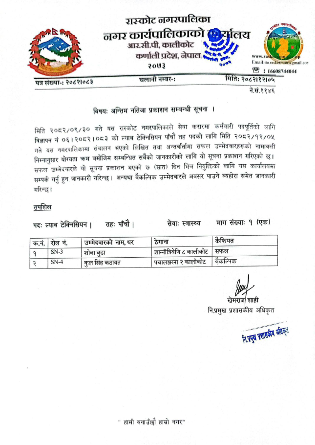 अन्तिम नतिजा प्रकासन सम्बन्धमा ।