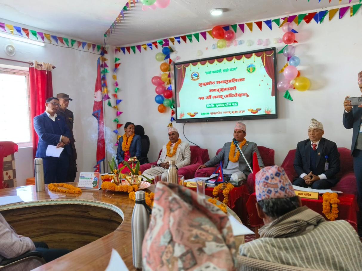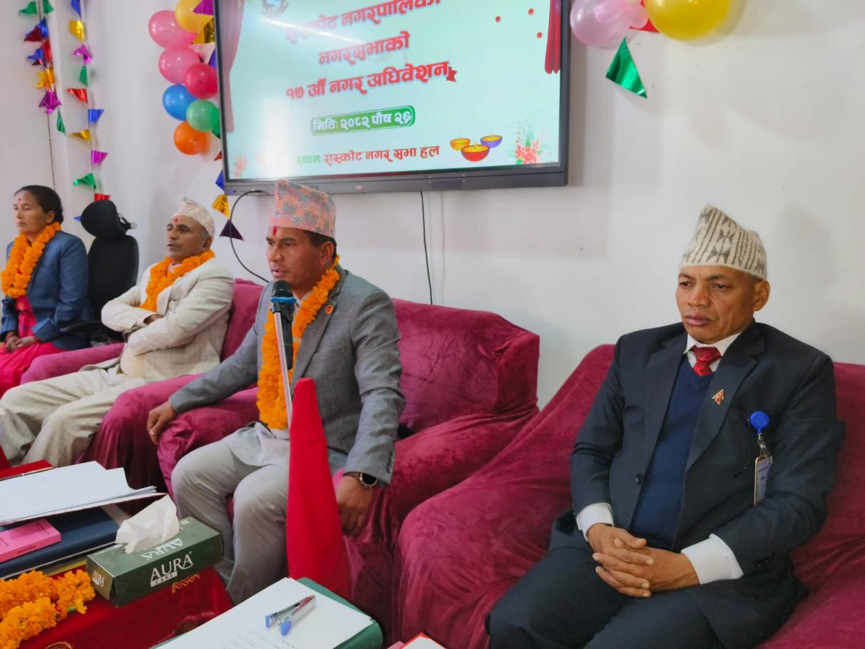 आज मिति २०८२/०९/२६ गते रास्कोट नगरपालिका नगरसभाको १७ औं नगर अधिबेशन सु-सम्पन्न भएको छ ।नगरसभामा नगर प्रमुख, उप–प्रमुख ,प्रमुख प्रशासकिय अधिकृत,वडा अध्यक्ष कार्यपालिका सदस्यहरु, विभिन्न उपसमितिका संयोजकहरु,नगरसभा सदस्यहरु,नगरपालिकाका शाखा प्रमुख ,कर्मचारी हरुको उपस्तिथि रहेको थियो।