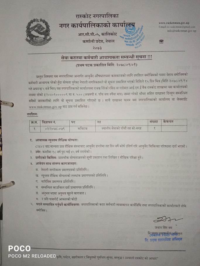 आयुर्वेद सेवा पाँचौ तह कविराज सेवा करारमा आवश्यकता सम्वन्धी सूचना !!!