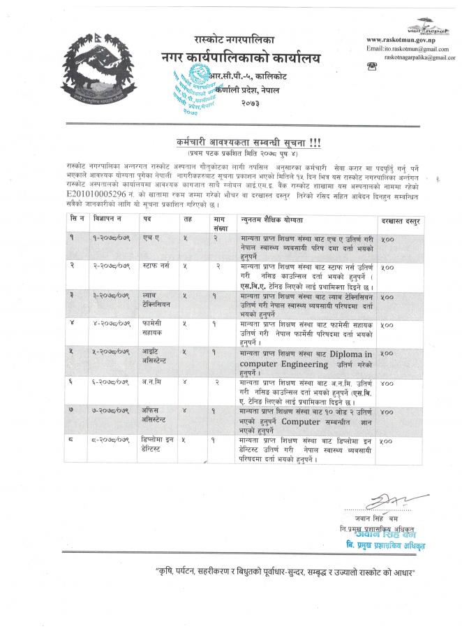 रास्‍कोट अस्पतालको लागि करार सेवामा कर्मचारी आवश्यकता सम्वन्धी सूचना  ।