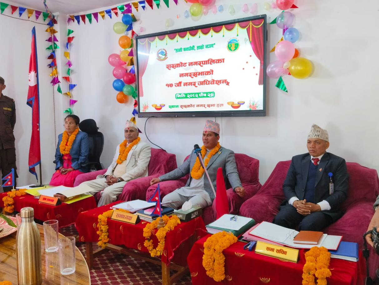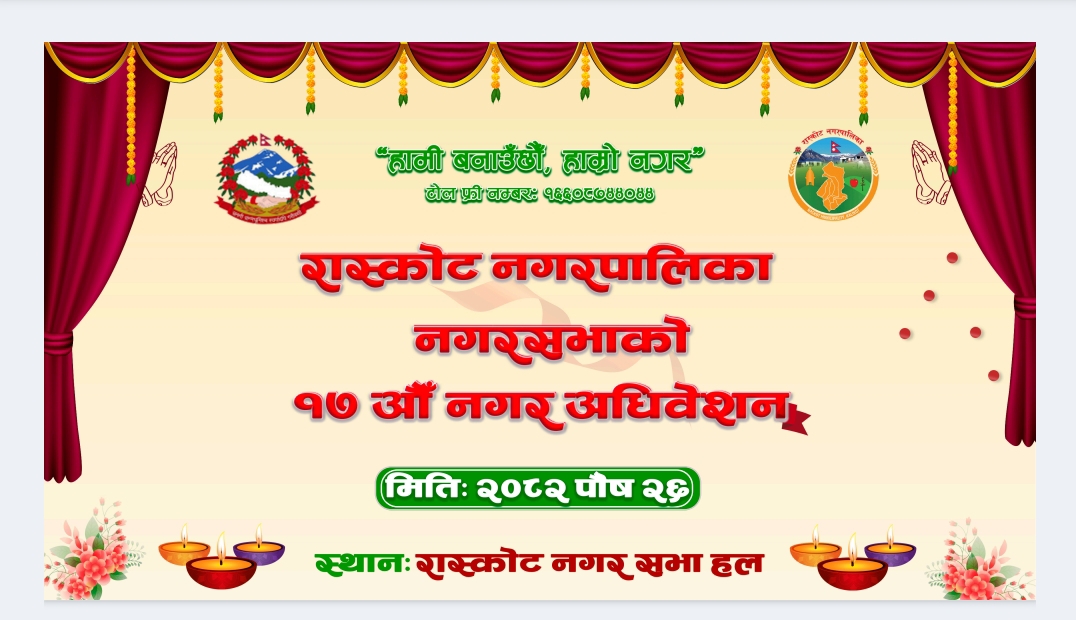 आज मिति २०८२/०९/२६ गते रास्कोट नगरपालिका नगरसभाको १७ औं नगर अधिबेशन सु-सम्पन्न भएको छ ।नगरसभामा नगर प्रमुख, उप–प्रमुख ,प्रमुख प्रशासकिय अधिकृत,वडा अध्यक्ष कार्यपालिका सदस्यहरु, विभिन्न उपसमितिका संयोजकहरु,नगरसभा सदस्यहरु,नगरपालिकाका शाखा प्रमुख ,कर्मचारी हरुको उपस्तिथि रहेको थियो।